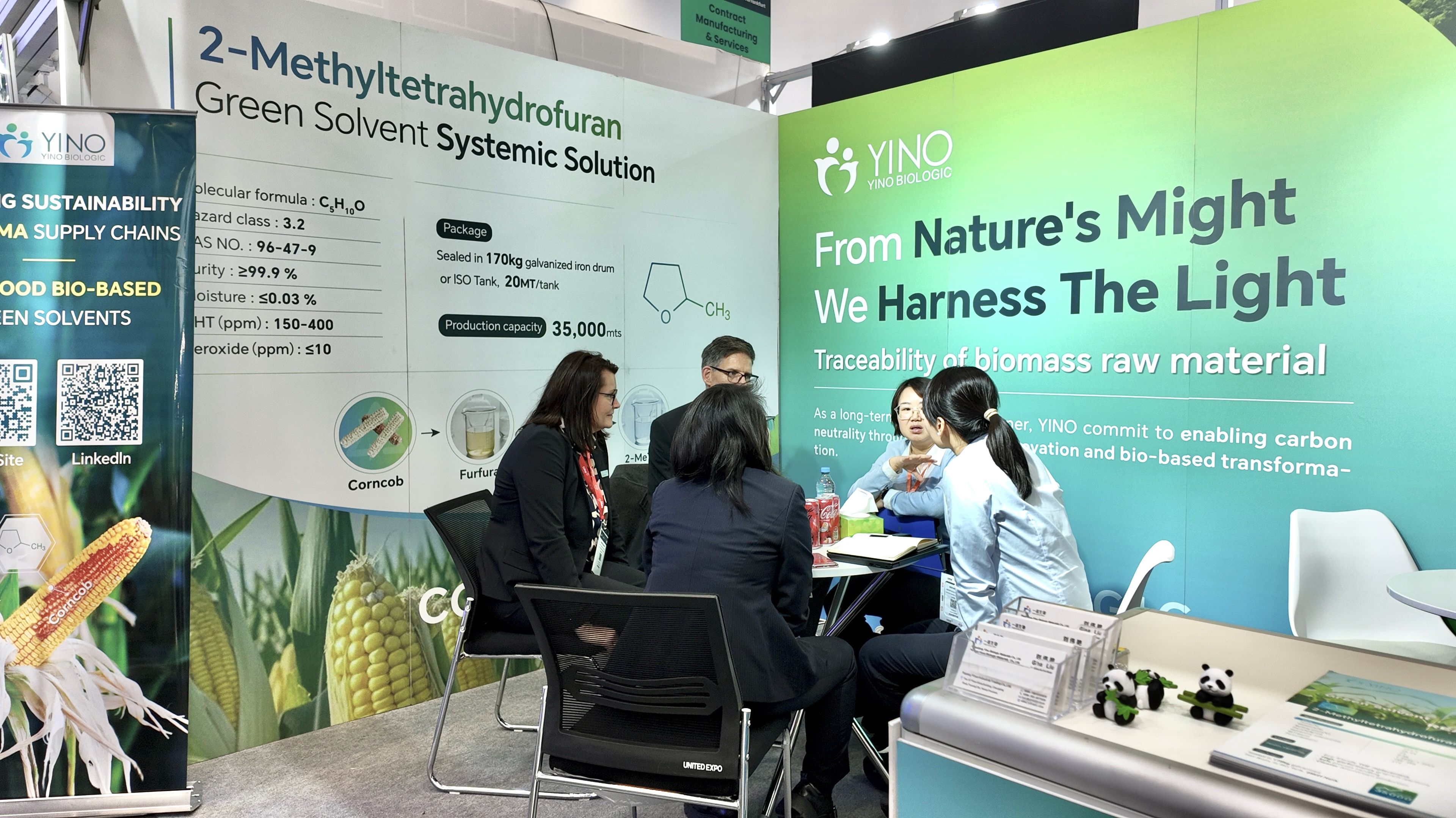 在制藥生產中,溶劑與原料的選擇不僅關系到工藝的安全性與環(huán)境友好性,更直接影響藥物純度和生產效率。YINO Biologic 以非糧生物質玉米芯為原料,從源頭實現(xiàn)碳減排與資源高效利用,構建了覆蓋從原料到終端制造的綠色供應鏈。本次展會上,公司重點展示了多款高性能可持續(xù)產品,包括可作為活性藥物成分(API)合成綠色溶劑的 2-Methyltetrahydrofuran(2-MeTHF),該產品可有效替代傳統(tǒng) THF,顯著降低揮發(fā)性有機物排放并提升反應安全性與效率;用于高端藥物保護基及精細化工中間體合成的關鍵原料 3,4-Dihydro-2H-Pyran(DHP);以及新一代高純度環(huán)狀酯原料 δ-Valerolactone(δ-VL),廣泛應用于藥物輔料及聚合物開發(fā)領域,充分展現(xiàn)了 YINO 在綠色化學與可持續(xù)材料創(chuàng)新方面的實力。